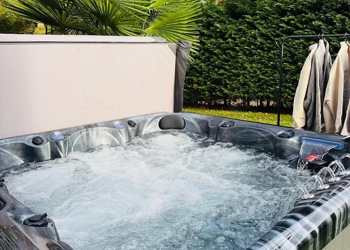 L'hébergement présente une salle de bains avec une baignoire spa, une toilette séparée et une douche. Un sèche-cheveux, des peignoirs de bain et des draps de bain sont également fournis pour votre confort.